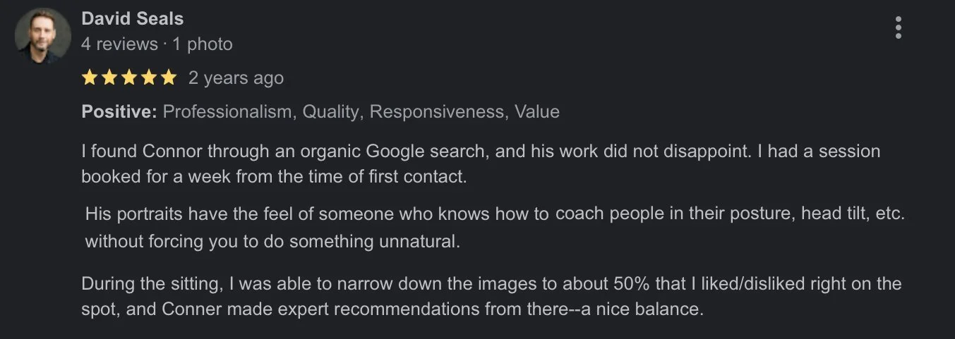Our clients love working with us just as much as we love working with them. With our focus on creating a fun but efficient workflow we are not only able to create imagery that helps professionals build more meaningful professional connections, but we do so in a way that takes away all the discomfort of a typical headshot session. Don’t believe it? Then check out a few other reviews people have left us over the years!